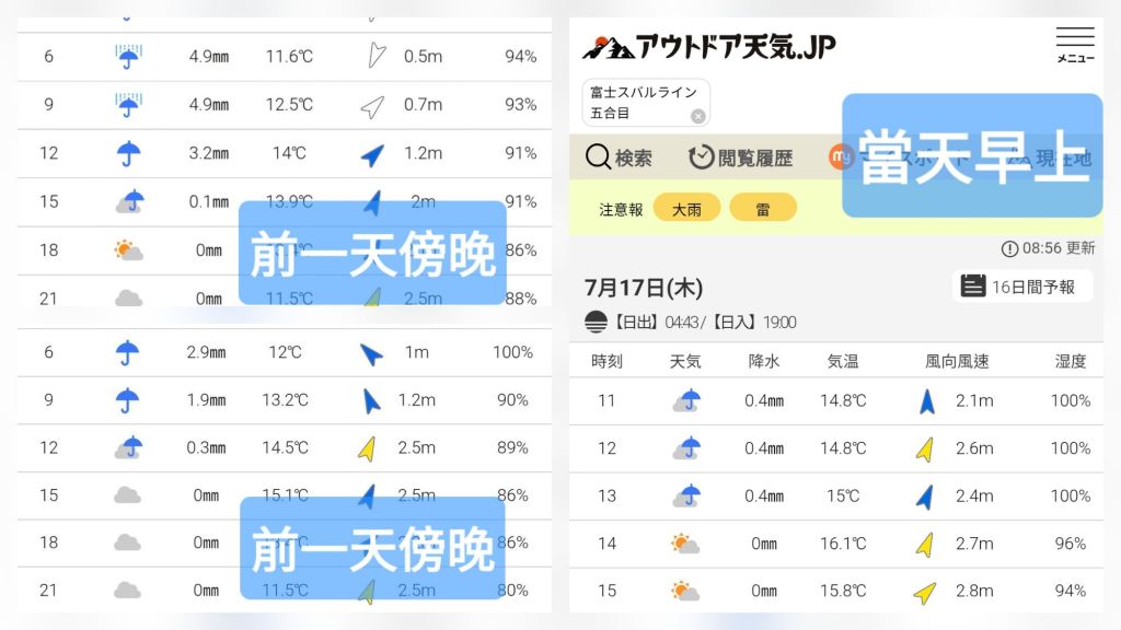 我們出發前,正好是日本梅雨(看新聞才知道)的末期,加上颱風才剛經過。前兩天都在下大雨,直到第三天早上出門,地都是濕的。一路上都顯示出發日中午都會下雨,要雨天爬山。為此,下雨裝備如防雨外套、雨褲還特別去迪卡儂加強一番。