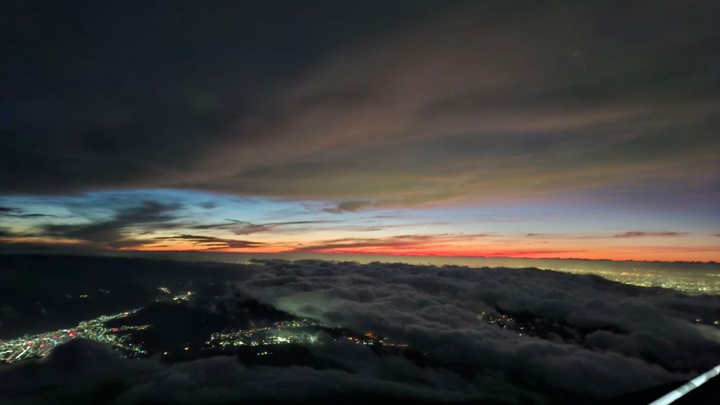 步步接近心目中之神山攻頂,黑夜裡燈火通明形成一條長長的人龍。4:20來到八合目最後一個山小屋御來光館,看日出。雲海壯闊,真是漂亮。