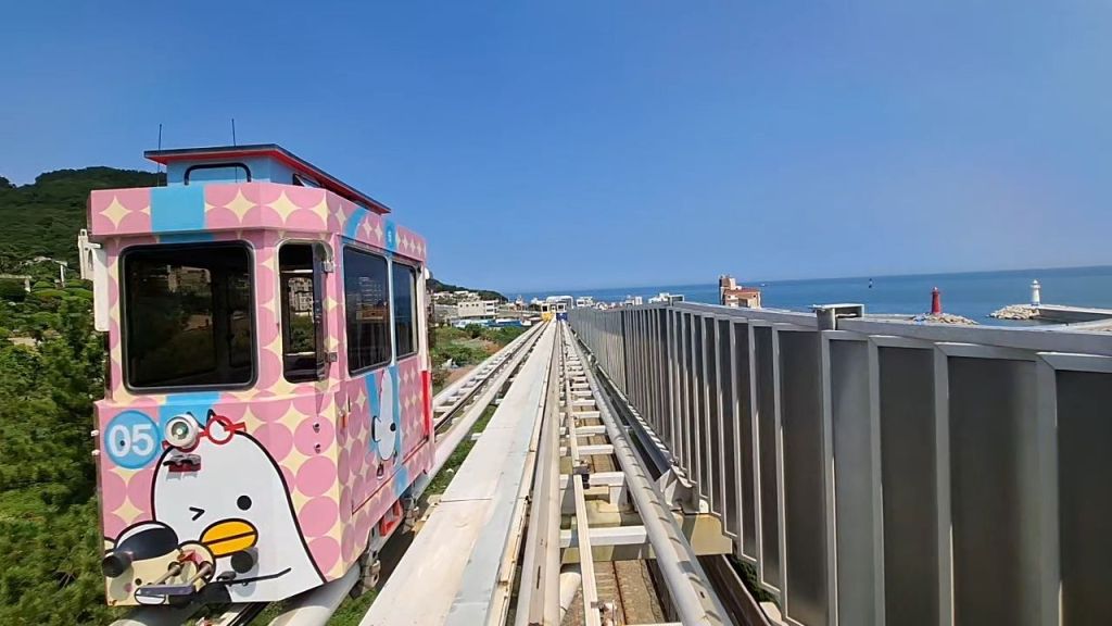 熱門的「膠囊列車」從尾浦站(미포정거장)搭乘,一周前訂幾乎沒有位置。,尾浦出發可以感受到海岸線一路延展的開闊感。小小的車廂就像透明玻璃盒子,帶著點童趣。這段沒有Pass用,四個人票價50000韓元。