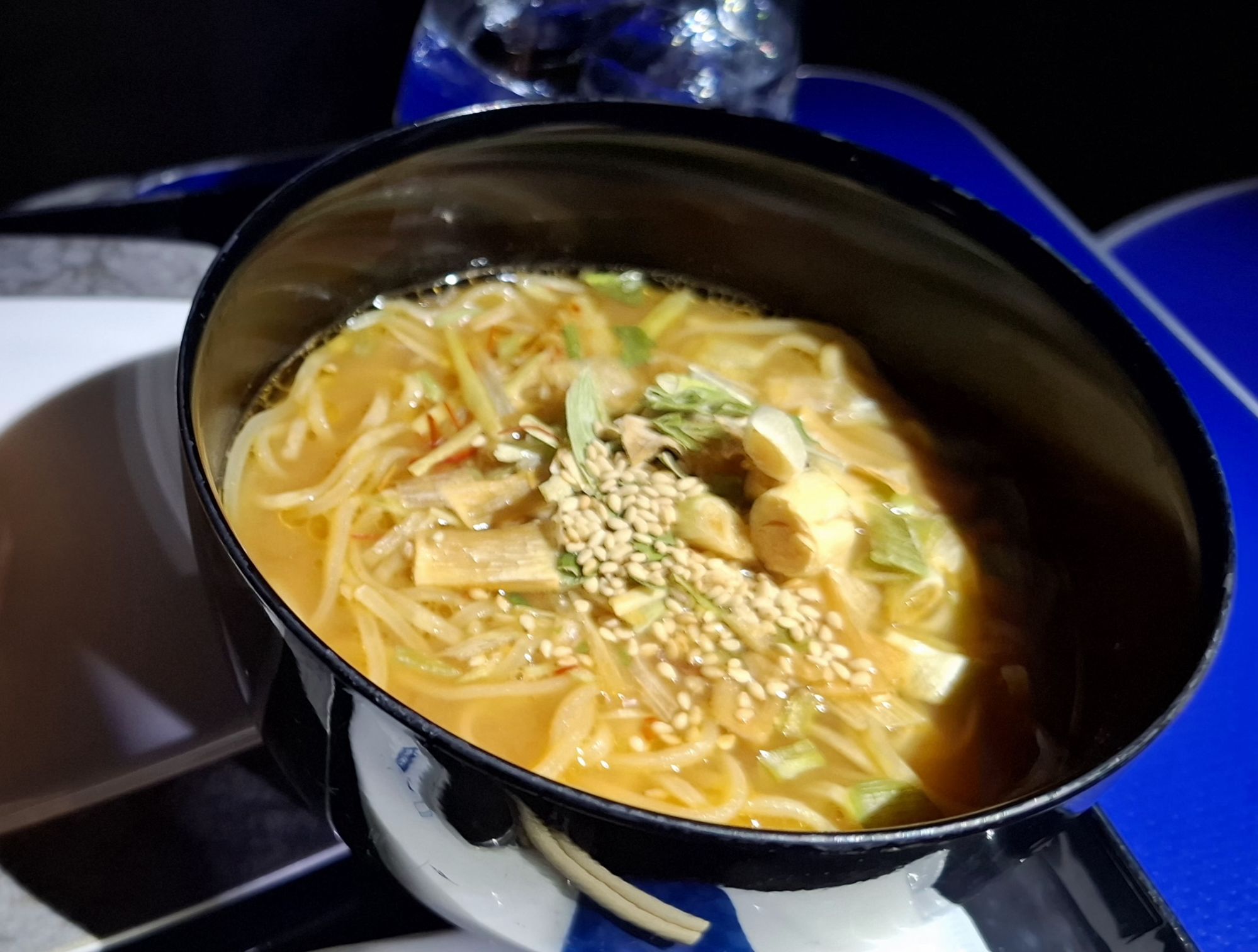沒有吃起飛後的小食,不過點了ANA拉麵,這段是北海道味增口味,以我這麼能吃鹹也覺得稍微鹹一點,以飛機上餐食觀點,也算是蠻好吃的。