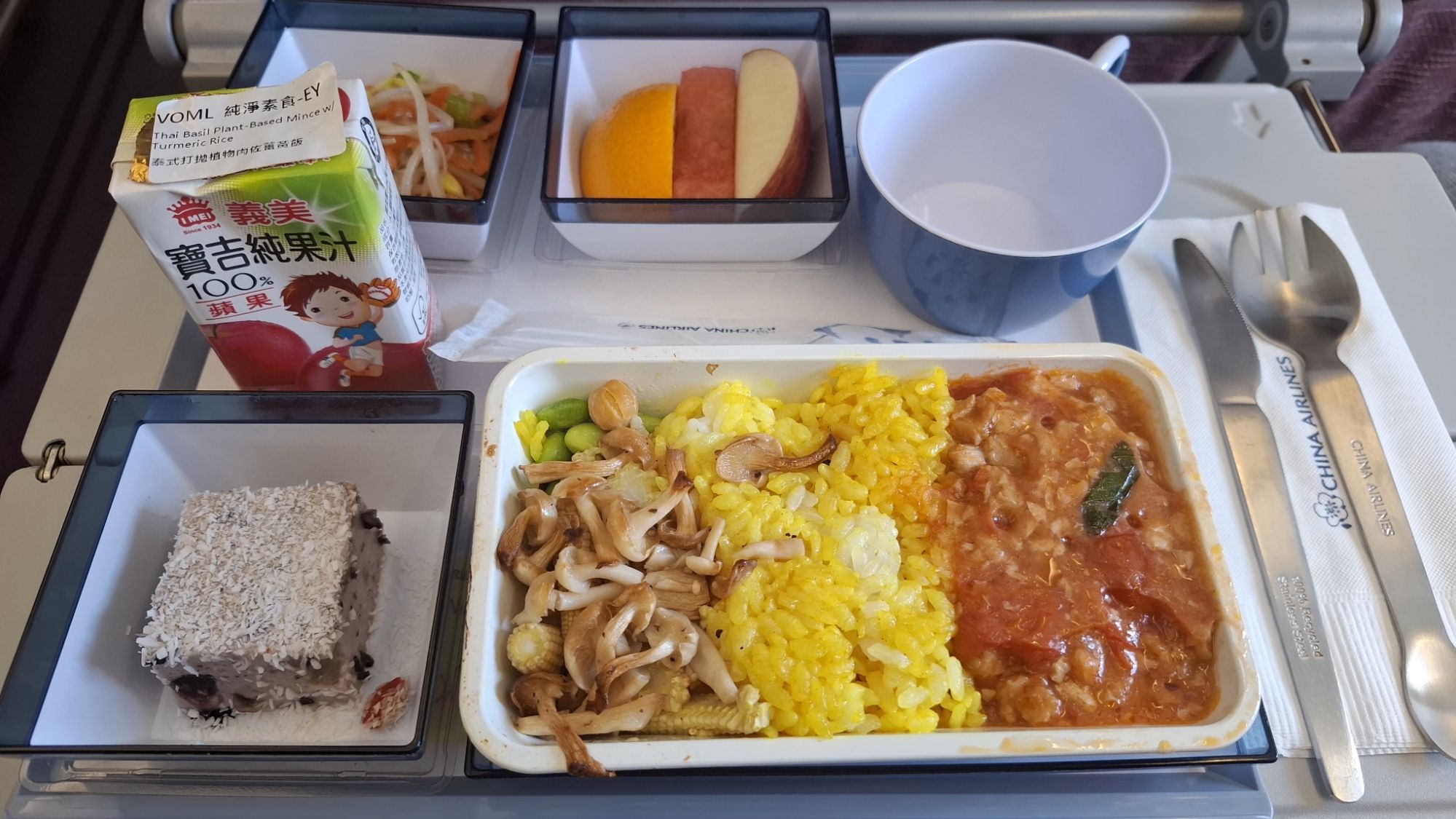 椰漿咖哩雞,以飛機餐的觀點算是很不錯,調味適當、雞肉不柴、連四季豆都比普通的青江菜賣相好的多,泰國米的搭配也比一般米更適合。配菜是南亞搭配檸檬的蠶豆番茄沙拉,還可以。麻糬有點南洋風格,水果與麵包則是中規中矩。