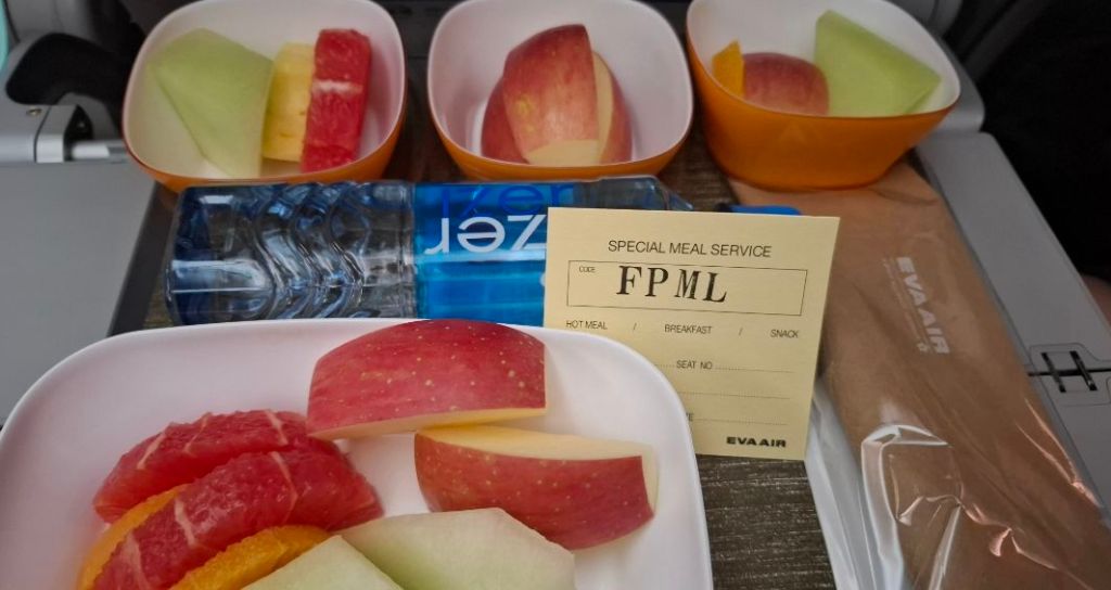 評價:主餐是馬鈴薯泥配花椰菜泥,很大方使用了經濟艙不會用的鮭魚而且不柴。馬鈴薯沙拉中規中矩(沒有沙拉醬),水果竟然是剝皮的荔枝與橘子,都屬於非常好吞嚥的選擇。