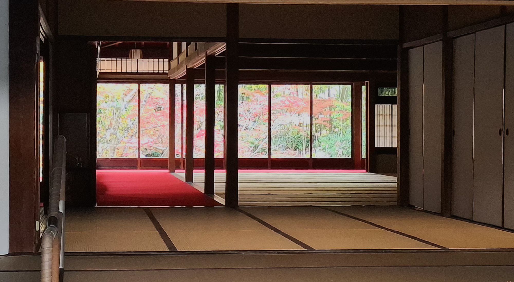 天授庵:枯山水庭園與池泉迴遊式庭園被楓葉包圍,夜晚燈光下更顯華麗。
