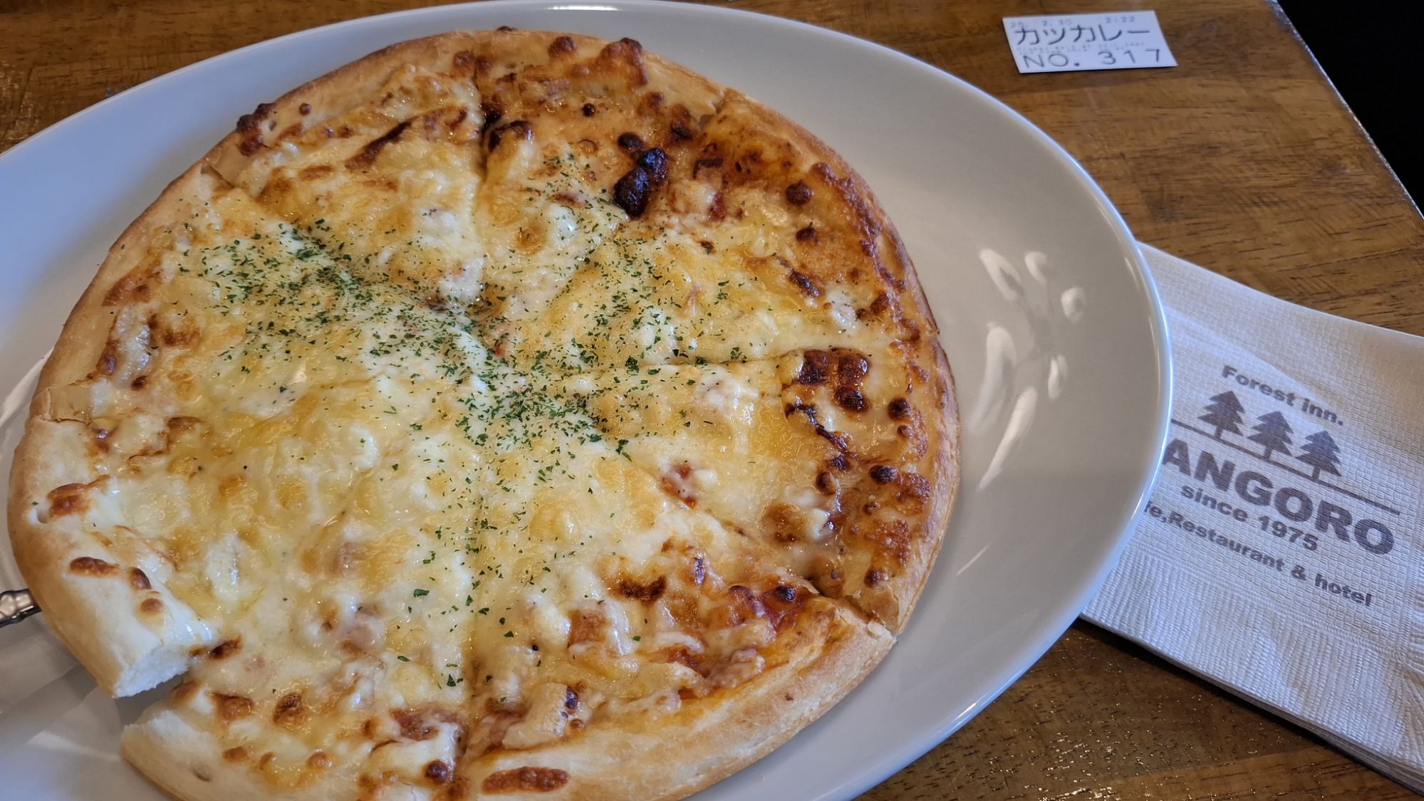 咖哩豬排屬於典型的日本濃郁系,鹹甜適中,對於剛從寒冷的雪地進來的人來說,辛香料的味道非常開胃且暖身。小屋提供的是薄皮類型的披薩,這與其歐式小屋的定位非常契合,起司給得很大方。