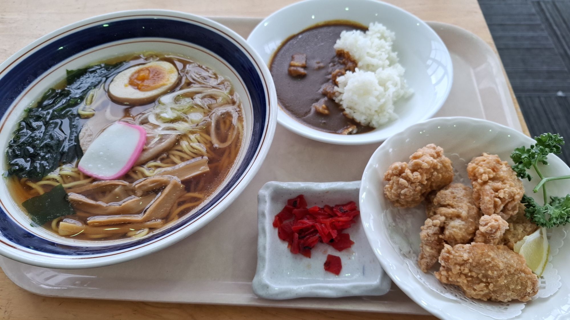 午餐:黑姬餐廳,餐廳靠近黑姬纜車與滑雪道,適合滑完後用餐,提供日式簡餐與熱食,環境舒適方便。點了拉麵套餐含咖喱飯,加上一份炸雞。價格親民,搭配落地窗可欣賞景觀。